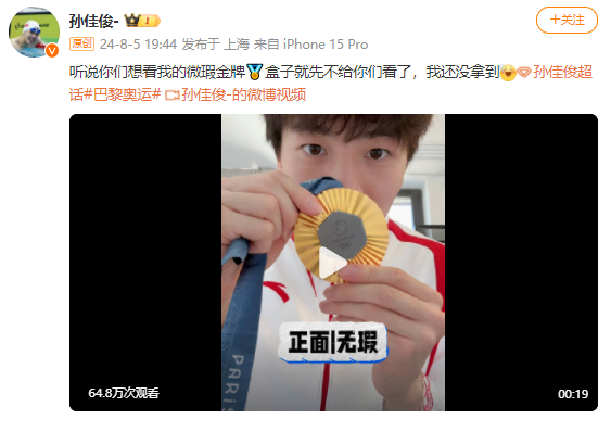 授奖台上,孙佳俊对着傍边的覃海洋说:“(金牌)这背面有污点啊。”同日,孙佳俊在外交平台上更新视频,文书金牌有污点:“没思到一醒觉来,大家都知谈我的金牌有污点了,嗅觉是有少量,不外不垂死,这是我的第一块奥运金牌,我的专属图章!99新,微瑕,不出!”