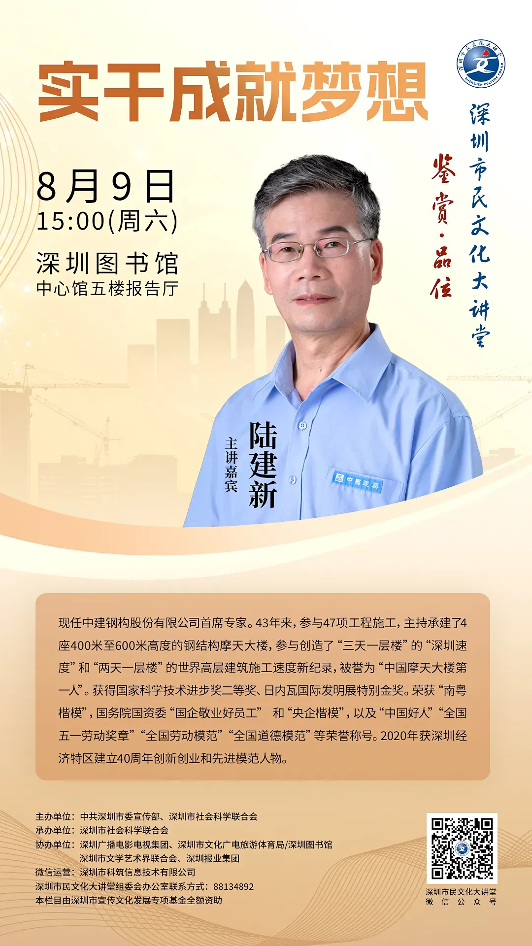 主讲东说念主:陆建新,现任中建钢构股份有限公司首席众人。43年来,参与47项工程施工,主捏承建了4座400米至600米高度的钢结构摩天大楼,参与创造了“三天一层楼”的“深圳速率”和“两天一层楼”的世界高层建筑施工速率新记载,被誉为“中国摩天大楼第一东说念主”。